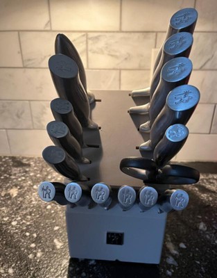 The slots in the block aren't wide enough to hold the two large knives (chef's knife and Santoku knife). I truly don't understand how Zwilling even sells this product.