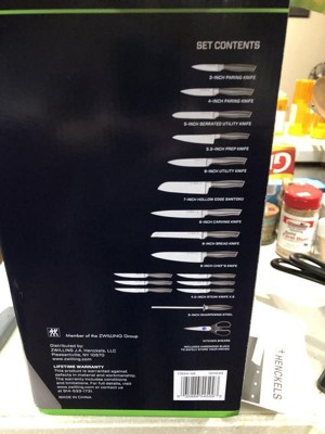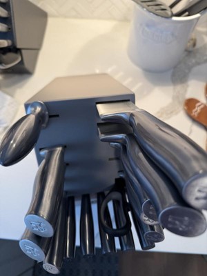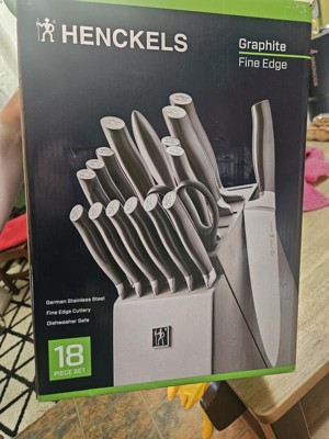 I am very picky about knives I use. I received the Henckels 18-pc Knife Set, Graphite, as a gift for Christmas and have enjoyed using them. The knives are comfortable to hold and use. They seemed like they’d be a little slippery to use but I haven’t found that to be the case. I haven’t had to sharpen any of the knives yet, but appreciate the instructions on how to sharpen the knives correctly. Care instructions were very clearly written.