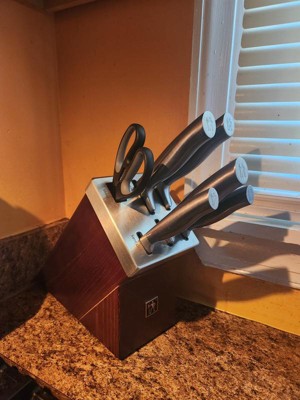 Henckels International makes essential kitchen tools that every home chef needs. Created in 1895, this time-honored brand offers high quality at an exceptional value.Sharpness is always in reach with Henckels International Self-Sharpening Graphite Knife Blocks. The self-sharpening slots boast built-in ceramic honing wheels that automatically sharpen when knives are stored or removed.With these must-have knife blocks, enjoy effortless sharpness for precise prep work every time. Plus, their handsome stained ash wood base and stainless steel cap add aesthetic appeal to your countertop.Tailor-made for J.A. Henckels International Graphite knives, these blocks help you maintain the superior sharpness of their fine edge, precision-honed blades. With a seamless transition from blade to handle, the knives' fully forged construction provides balance while their traditional triple-rivet handle encourages tireless cutting.