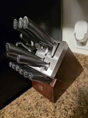[This review was collected as part of a promotion.] This knife set is amazing! Great quality, it matches the color scheme of our kitchen, and I love having the built in knife sharpener! There is a knife for every use so no one is getting worn out quickly. 10/10 would buy again!