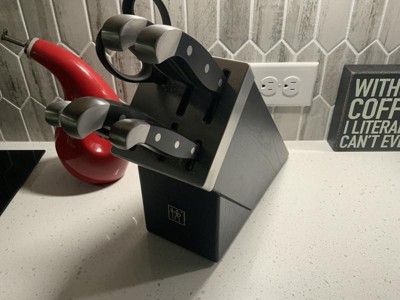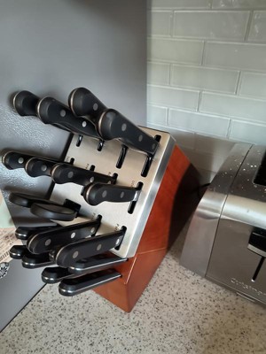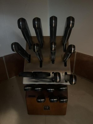 I’ve been wanting new knives for about 12 years and after all my research, Henkels was the brand everyone suggested. Glad I went with it because I love my new set! The knives are SHARP, I haven’t been able to slice something so easily in years. The block is way longer than my previous one (probably because it’s a self sharpening block?) but it look gorgeous in my kitchen! Will be recommending this set to everyone!