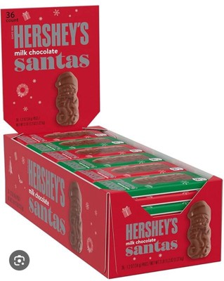 A: We're glad of your interest in our HERSHEY'S Christmas Milk Chocolate Santas Candy. We invite you to email us at consumer@hersheys.com and mention Case No. 11417159 so we can further assist. Thank you.