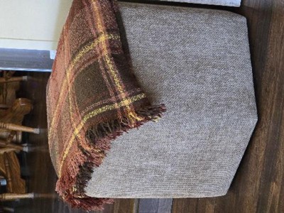 I purchased this piece to add some warmth to my living room and it delivered! I love the non traditional shape of the ottoman, which is something not usually seen. It is made of almost like a soft woven chenille. It’s perfect! Mine did not have a smell as mentioned in a previous review.