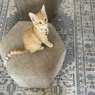 They go perfectly with my rug, complimenting the design and colors. It also serves as extra seating and works well for putting my feet up for watching tv. The fabric also seems to be good quality and is soft, but time will only tell. So far I absolutely love it, and so do my kittens.