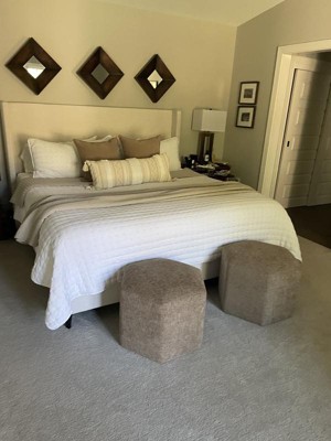 Love these ottomans! I’m using them at the foot of a bed to serve as a place to throw clothes or sit to put shoes on or for my dog to use to help get on to the bed. The quality is great for the price. They’re lightweight but definitely substantial enough that they don’t feel cheap in anyway. Love the color for a masculine look. And appreciate the unique shape! No assembly required