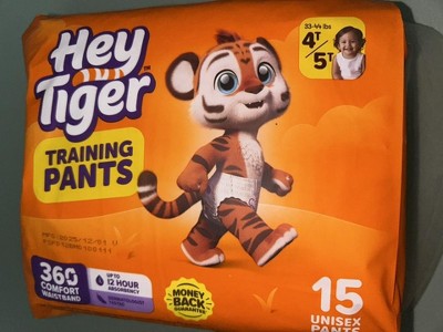 Available in sizes 4–7, Hey Tiger Training Pants are tiger-tough on leaks, made to stretch and move, and priced for smart spenders — so you can pay less and they can play more.