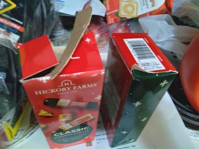 My husband loves Hickory Farms products, so I bought several of these for him and to give as gifts. Unfortunately, I cannot give them as gifts, because TARGET decided to put ALL OF MY ORDER IN ONE BOX that weighed almost 40 pounds! The heavy Tide container and all the canned foods crushed those Hickory Farms boxes. Some of the contents were scattered. In fact, FEDEX had to re-box and re-label everything, but it was still ALL DAMAGED!
