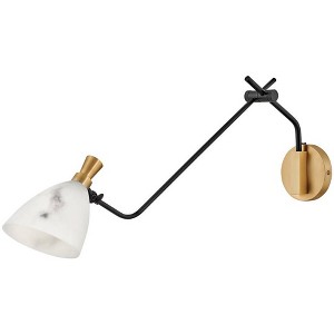 Influenced by a Mid-Century Modern aesthetic, this dimmable adjustable swing arm wall lamp's striking profile is accentuated by stunning details. From the Sinclair collection by Hinkley, a classic finish combination of black and heritage brass is paired with a luminous, luxurious cloudstone glass bell shade. Its sophisticated design is perfect for a cozy reading nook in a bedroom or for focused illumination in a home office.