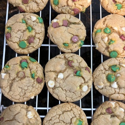 While I really appreciate that they did not use artificial dyes, the results are meh. Not really red, and the green chips leave a very unappealing fluorescent yellow substance behind which sometimes bleeds into the surrounding cookie like a halo. Also just taste like sugar chips to me. Will not buy again.