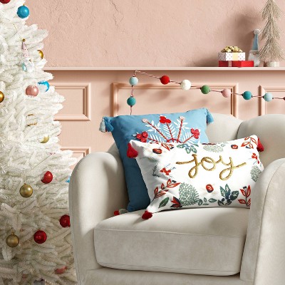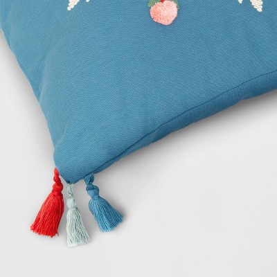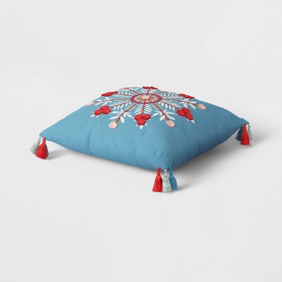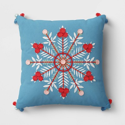 The Square Embroidered Snowflake Pillow from Opalhouse™ helps create a stunning look that's just perfect for the holiday season. Adorned with an oversized embroidered snowflake motif in vibrant hues across the front, this blue decorative pillow is finished with three tassels in red, blue and white that accent each corner for additional flair and a playful look. Featuring a 100% cotton exterior and generously filled interior, this square accent pillow provides plenty of cushioned comfort while you sit, relax or lounge. Toss it on the floor or prop it on your fave seat as a solo accent piece, or mix and match with coordinating or contrasting pillows for dynamic appeal.