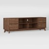 Take your living room to the next level with this stylish modern TV stand. Made with flared wood legs, four drawers, and open shelves for a mid-century modern appearance. This entertainment center creates additional storage space in your home for media, electronics, accessories, books, or decor. The beautiful rich wood grain finish looks great in any aesthetic. This bench fits most TV's up to 85" and is the perfect combo of classic colors and modern lines.