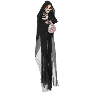 Eerie Animations and Sounds: Enhance your grim reaper Halloween decoration setup. When it senses trick-or-treaters, this outside Halloween decoration will begin to play guitar (audio included) while its eyes glow red.