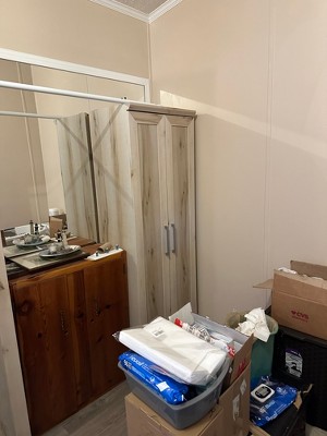 This is specifically for our cleaning/toilet paper storage. It fits well in our wide hallway. Size/color is perfect. I'm not sure why the top was unfinished, unsealed particle board. We can all see the top when we walk by...we are a pretty tall family. Wouldn't have cost much to finish the top...:(