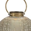 This 12-inch bronze and green distressed lattice metal tabletop lantern candle holder adds flair, function, and visual interest to any home or special occasion. Dress up your home to impress every season with this fabulous candleholder that features a pierced design in a warm golden bronze color with a rustic green patina. This rustic candleholder is a decorative accent onto its own, with or without candles. 11.50-inch h x 10.50-inch w x 10.50-inch d.