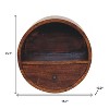 Give your room the look and feel of 5-star accommodations with this 16-inch chestnut solid wood round one drawer floating nightstand. Maximize your floor space and adjust to the exact height you need, when you add this wall-mounted design to your space. Sturdy and durable construction from solid mango wood with a rustic finish ensures this trusty bedside table is built to last. Includes a drawer to help keep your essentials close by and hidden. An easy-access shelf gives you additional storage and display space. The unsung hero of the bedroom, this nightstand is perfect for keeping a glass of water, lamp, alarm clock, jewelry, and more, close by and easily accessible. 15.70-inch h x 15.70-inch w x 10.20-inch d.