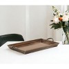 This 19-inch brown wood handmade serving tray with handles will add a beautiful decorative accent to your decor. This gorgeous rectangular serving tray is made from genuine wood providing both durability and a classic look. Features handles for quick and easy transportation. Intended for decorative, non-food contact only, it's the perfect decorative accent piece. 2.25-inch h x 18.5-inch w x 12.5-inch d.