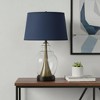 Bring of level of elegance and freshness to your space with this high quality 30" antiqued brass and glass table lamp with navy blue empire shade. The base of this lamp is made of metal finished in a antiqued brass tone. Includes a navy blue fabric, empire shaped shade, making this a fashionable piece that will complement most any interior. This standard table lamp is designed to provide general lighting to the area. High quality design makes this a great lamp for not only lighting, but accenting a room with style. The perfect lamp to create just the right natural and soothing light in your space. 30" H x 19" W x 19" D