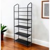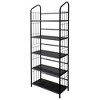 Sturdy and built to last, this 64-inch black metal five tier bookcase helps you display your books, files, photos, and treasures in an organized fashion. Features 5 shelf tiers for storing books, displaying photographs, plants, or other decorations. Great to use independently or pair with additional units to create a different look and add even more storage. Increase your room's capacity for storage and display with this great shelving unit. 64-inch h x 26-inch w x 11-inch d.