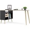 - L-shape work surface with three fixed shelves and two drawers under table top