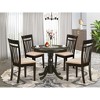 - This complete 5 piece dinette set includes a round dining table and four cushion seat dining room chairs, all finished in a beautiful Cappuccino hue to enhance your dining room decor and create a welcoming atmosphere for family and friends.