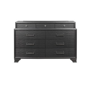 Introducing the Jordyn grey 9 drawer dresser by Global Furniture USA, designed with sturdy construction and contemporary styling. Features include 6 large spacious drawers and 3 small spacious drawers. Intricate features include a bar style drawer handles, bracket style feet, and textured drawer fronts which together create this versatile dresser fit for any decor style. Choose the Jordyn grey dresser to upgrade your bedroom instantly!