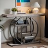 - This console table combines industrial chic with rustic charm, featuring a rugged circular base and warm finished shelves, creating a striking centerpiece in any hallway.