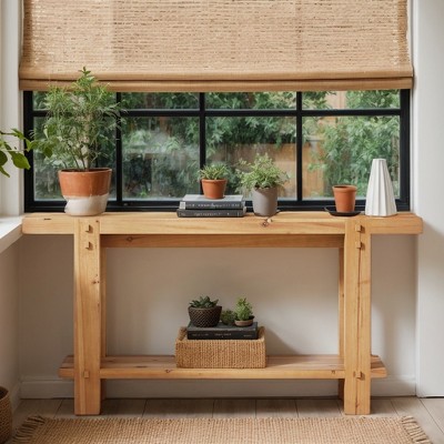 This narrow solid-wood console stretches slim along walls or sofa backs, offering a smooth plank top and roomy lower shelf to store and display everyday essentials. Natural grain shines through a rustic matte finish that blends with any décor—assemble in minutes and add timeless warmth to your space.