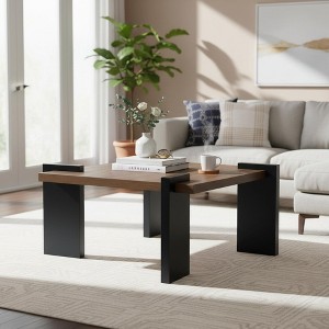 This coffee table offers a clean, modern look with a walnut-colored MDF tabletop and bold black legs for a striking contrast. Designed for living rooms, lounges, or small apartments, it provides a stable surface for daily use—from morning coffee to décor displays. The rectangular and square size options make it easy to fit different layouts, whether centered in a sofa setup or paired as a low accent table. Its smooth top is simple to clean, and the solid panel legs add a grounded, architectural feel to contemporary spaces.