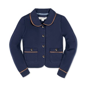 For a put together finish, our collared jacket in luxurious organic cotton blend ponte will be your girl's chic layering piece for cooler weather. Features classic details like faux suede piping, gold buttons, and front patch pockets. Coordinates perfectly with our collection of organic cotton knit tops, skirts, and leggings.