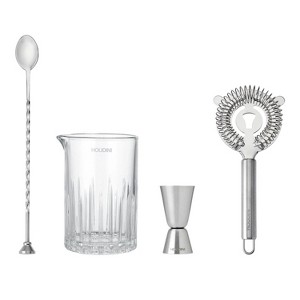 - Includes: Stirring Glass, Strainer, Jigger and Spoon