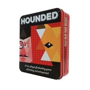 Hounded is a smart, asymmetrical game for two players, with surprising depth and great replayability. The Fox player must elude pursuers while the Master of Hounds commands a diverse hunting party with a variety of capabilities. Both compete over a playing field where different tiles are discovered and turned up, with varied effects. The Fox must avoid capture until three time tiles, or 43 tiles of any kind, have been revealed. The Master of Hounds must trap the Fox or force him to end a turn adjacent to the Master himself. Wildly portable and with a small footprint, Hounded is the perfect grab–and–go game for coffee shops, restaurants, the library, and more.