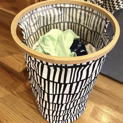 Really attractive, inexpensive hamper. Love the pattern and the wood around the top. Bought this one and another pattern for each of my kids’ bedrooms and both work perfectly in small spaces. Great size if you do laundry frequently; fits one large load loosely with a little extra space so could definitely fit two smaller loads. The thick coated canvas-like fabric stays upright even when empty. I can’t say how durable it will be since I’ve only been using for about a week, but so far it’s great. For the price I would definitely recommend.