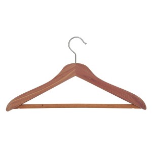 This cedar coat hanger has the best design and materials of any I have experienced. It has great rounded contour at the shoulder for protection the the garment.