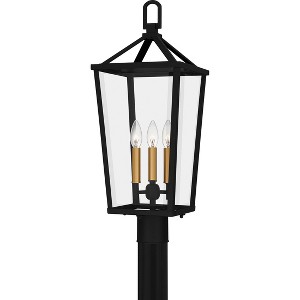 Hull is a traditional outdoor lantern collection designed for sleek exteriors. The tapered frame is finished in matte black and accented beautifully with gold candle sleeves for a hint of luster and industrial style. Clear beveled glass panels complete the look and showcase the natural beauty of the light. Hull is available as a complete collection - round out your home's exterior with a hanging lantern, wall lanterns, or a post lantern.