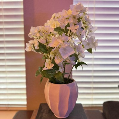 [This review was collected as part of a promotion.] This is a beautiful photo hydrangea plant. It looks very real. I put it in my living room and got so many compliments on it. The ceramic vase that it comes in is a great quality and really goes nicely with the hydrangea plant and the greenery. I would highly recommend this plant if you’re looking for something to spruce up your room.