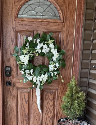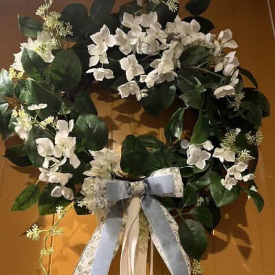 [This review was collected as part of a promotion.] This really is an awesome item to decorate your home with. This wreath is made of nice, full greenery, and very beautiful beach hydrangea plants. This wreath very much looks like like which I can appreciate. It hangs easily on the door, but can also be used as a decor item for a table or floor. This is perfect for any season.