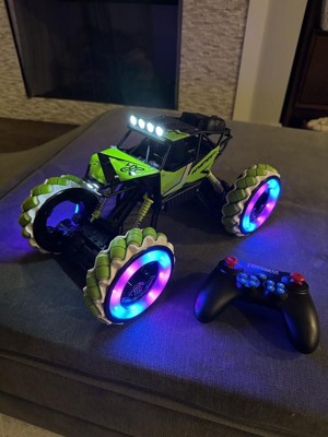 Nice size RC vehicle. Can move in multiple directions and lights up as well. Charges with USB charger with is a plus.