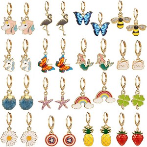 Pack of 16 pairs small gold =earrings. Includes a variety of animals earrings, fruit earrings, unicorn earrings, butterfly earrings, bee earrings, mermaid earrings, beach earrings, daisy earrings, pineapple earrings, strawberry earrings and so on