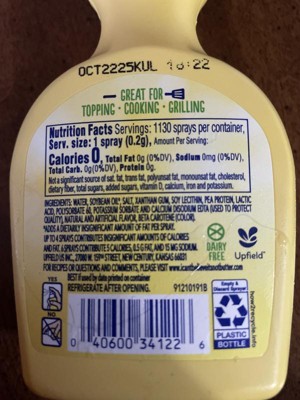 - 0 CALORIES PER SPRAY: Up to 4 sprays contributes insignificant amounts of calories and fat. 6 sprays contributes 5 calories, 0.5g fat and 15mg sodium. 1 spray = 1 serving.