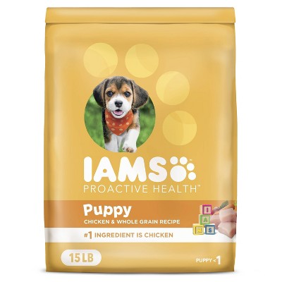 IAMS Puppy Food This is a chicken & whole grain recipe,my adult dog grew up on this.Her puppies will love it also as soon as they are big enough. It's healthy for your puppies brain & vision development this comes in assorted sizes & flavors. The perfect puppy food at a affordable price.In a few more weeks my 6 puppies will be eating this as well as their mother did.