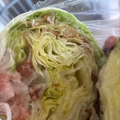 Outside of lettuce looked old & inside had brown pockets throughout. Disappointed.