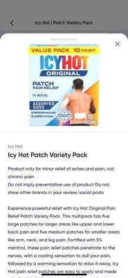 [This review was collected as part of a promotion.] I received this free complimentary product in exchange for a review on my social media platform. Icy hot comes in many forms including the patch in which you peel off one side of it and stick it to wherever you are having pain. It feels just like it says~ icy cool & hot at the same time! They are a good size and fairly priced but if you sweat they seem to want to peel off your body so in the Summer it might be a no go.