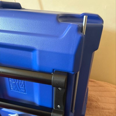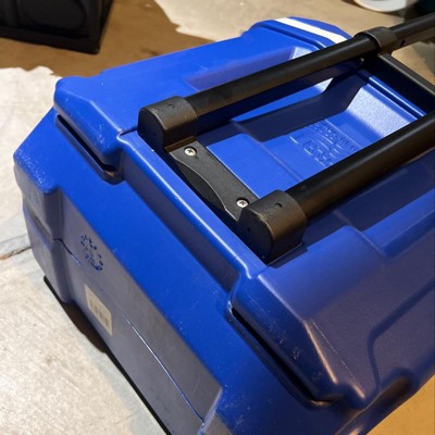 Designed with wheels and a locking, telescoping handle for easy push or pull transport and molded-in side handles for easy carrying, loading and unloading