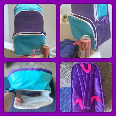 This backpack cooler is a good size. Lightweight and doesn't feel flimsy. I don't think it would feel comfortable to overpack this, but still, the straps are comfortable for being half full. Plus-size friendly. A bigger person could wear comfortably using both straps and they didn't even have to extend the straps all the way. You've got the large cooler pocket with a large zipper that extends enough to get to your cold drinks. The zipper outside is great for your utensils or bottle openers and napkins. This would be great for taking your lunch for a day trip or packing for a road trip. I could see me using this as a lunch bag for an all day school day. When my husband first saw the back, he asked me if I was "6 years old" because of the colors. But then he saw the retro colors and realized how cool it was. The retro color combo (purple/blue/pink) is great and I love the matching sets Igloo has...if they have them in stock.
