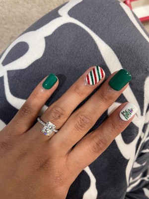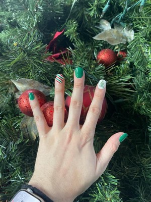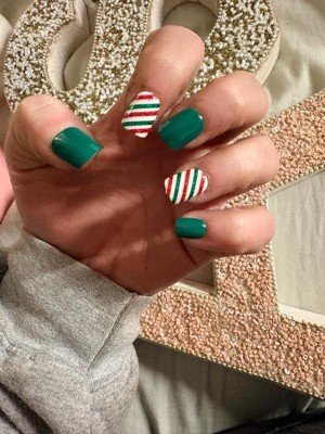 [This review was collected as part of a promotion.] Oh my goodness, these nails are absolutely dazzling! The combination of the solid green with the festive red and white stripes is so eye-catching. It's like a tiny party on your fingertips! Very comfortable for everyday tasks! And removal is so easy and not a bit painful!