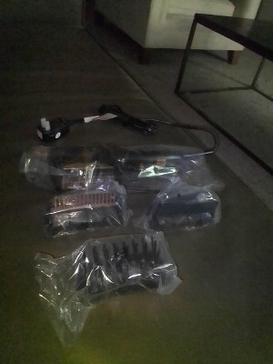 - 3-in-1 dryer with Bristle Styling Brush, Dual-Row Straightening Comb, and Wide-Tooth Thermal Detangling Comb. A lock button keeps attachments secure during use.
