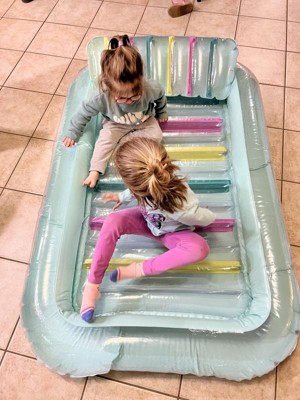 I had to review this from inside since I live in the Midwest and it’s still winter. But, we are going to have so much fun with this come summer! It’s a large float, as you can see my kids immediately played “boat” in it. It handled their playing and minor bouncing. The material is thick, and like my 3 year old said, “it’s pretty!” Bright, vibrant colors. I like that the pillow is detached so you can place where needed or go without. Looks like we’ll all be fighting over who gets to enjoy it this summer!