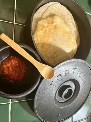 [This review was collected as part of a promotion.] Took a picture of this cast iron press sitting on the box so you can get an idea of how thin and compact this is! Got a little messy making flour tortillas from scratch, but using premade works great! Comes with a black plastic container that says “Tortilla” to keep your tortillas nice and warm just like the restaurant. Sad that the guacamole/salsa dip bowls were plastic instead of stone, but it probably makes it way easier to clean this way! Two wooden spoons makes the entire set complete for a Taco Tuesday~