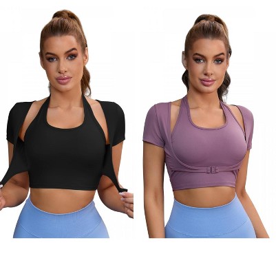 INSPIRE CHIC 2 Pcs Women's Halter Neck Short Sleeve Workout Crop Front Closure Slim Fit Fitness T Shirts