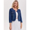 Modern denim cardigan updates your wardrobe. This women's collarless denim jacket cardigan featuring 3/4 sleeves is perfect for a contemporary and stylish look in 2026. Chic collarless design, the collarless style of this jean jacket adds a modern twist to the classic denim outerwear. Creating a versatile and on-trend piece, 3/4 sleeve coverage with 3/4 sleeves provides coverage and warmth. This denim cardigan is ideal for layering over tops or dresses in various seasons. Timeless denim fabric crafted from denim material, this cardigan exudes durability and style, making it a staple item for your everyday wear.